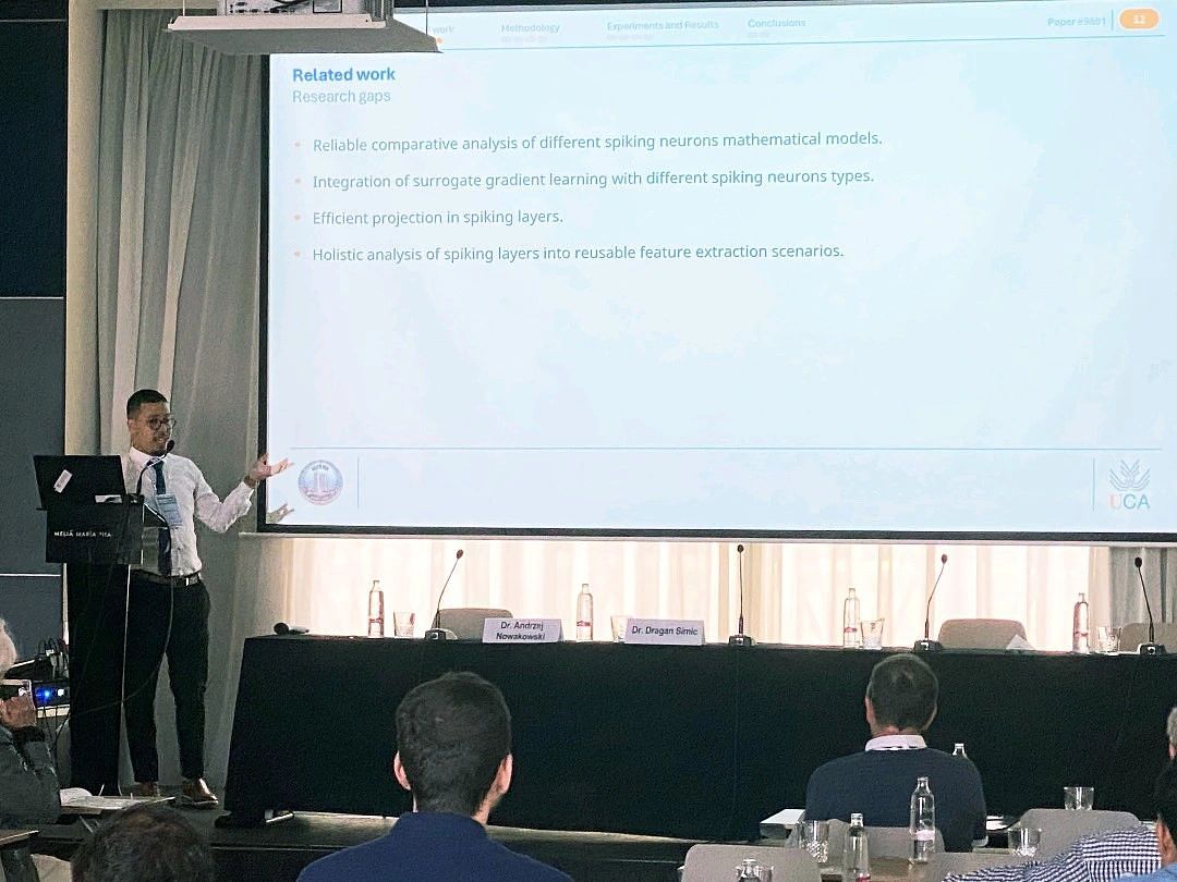 Our paper, titled โComparative Analysis of Spiking Neurons Mathematical Models Training using Surrogate Gradients Techniquesโ was featured during the conference and focuses on key advancements in the field of spiking neural networks (SNNs). Specifically, the study investigates the training of spiking neuron models using surrogate gradient techniques, proposes a new spiking layer implementation, and introduces an evaluation metric to support more informed architectural decisions.